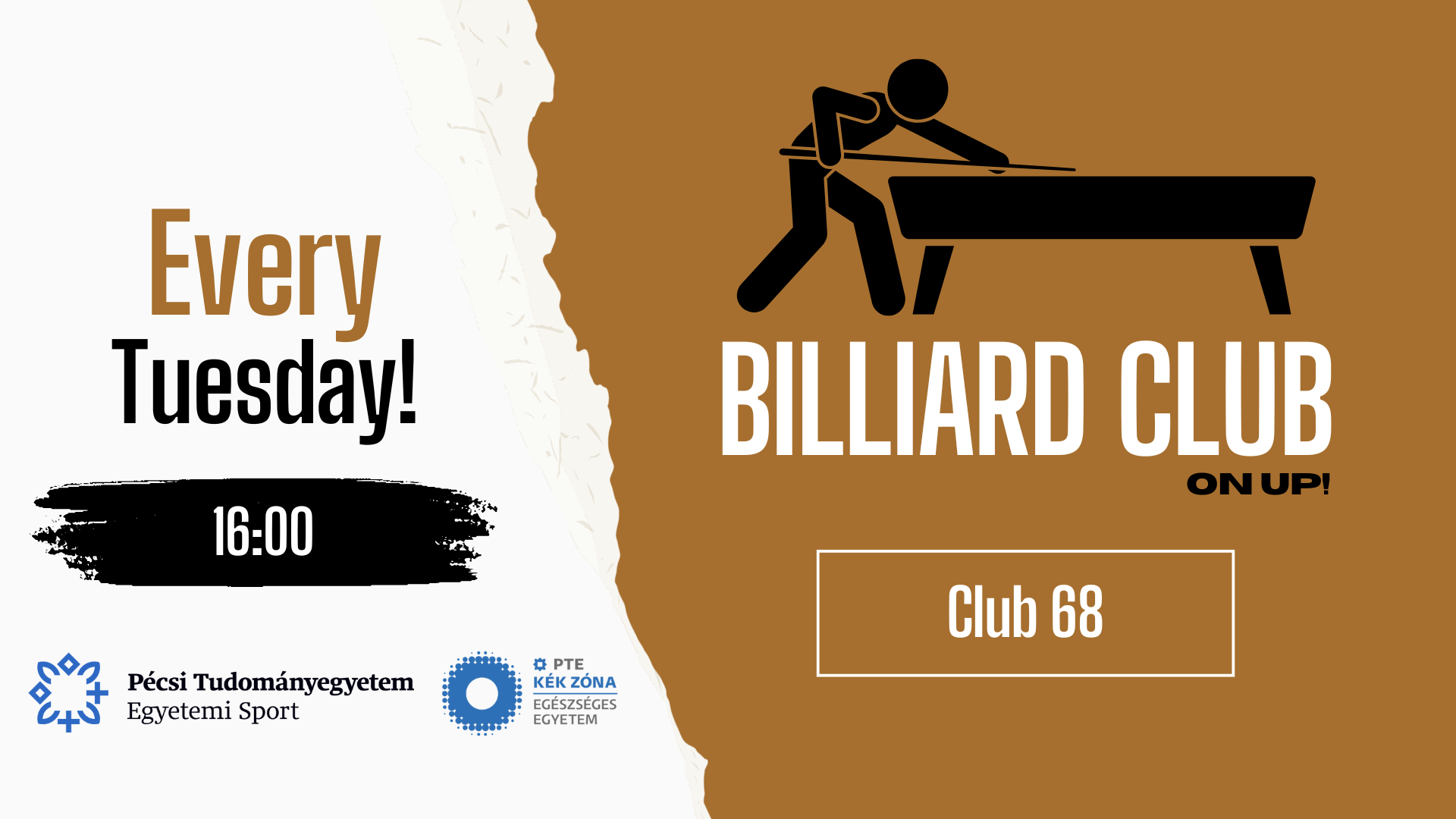 During the spring semester of 2026, the University of Pécs will provide free 2-hour billiards sessions on 5 tables on 10 occasions for PTE students and staff members alike. The sessions will be led by László János, Hungarian national champion player, member of the Pécs NB I team, and billiards coach.